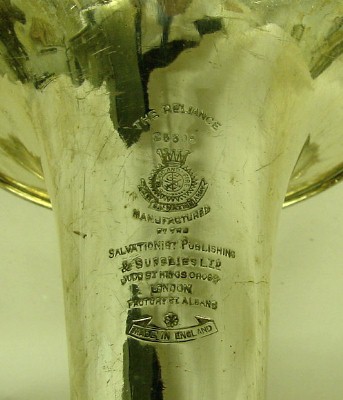 | Instrument - Alto Horn Museum Number - AH021 Maker -Salvationist Model -The Reliance Date of Manufacture - early 1900's ID # -25305 Surface - Chrome Markings - Manfactured by the Salvationist Publishing and Supplies Ltd., Judd St, King Cross London, Factory St. Albins England Historical Detail - 1901-1950 |