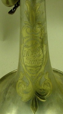| Instrument - Cornet Museum Number - CO065 Maker - J. W. York Model -Shepards Crook Date of Manufacture - 1910 ID # - 29688 Surface - Silver plate Markings - J W York - gold wash over name, comes with high and low pitch tuning slides Historical Detail - 1882-1940. Started by James Warren York in 1882, was a former employee of Boston Musical Instrment. Opened a factory in 1885 with Holton for one year. Joined by his sons in 1900 and operated as J W York & Sons, 1926/27 as York Band Instrument Co. The company was sold to Carl Fisher in 1940. |