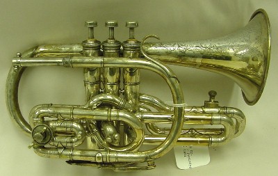 | Instrument - Cornet Museum Number - CO086 Maker - Besson and Company Model - Short with A quick change valve, Compensation instrument. Note extra tubing at the valves. Date of Manufacture - 1902 ID # - 61417 Surface - Silver Markings - The bell reads: 295 Regents St. London. Historical Detail - The Boosey company operated in England from 1851 to 1930 when it was merged in to Boosey and Hawkes. |