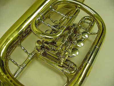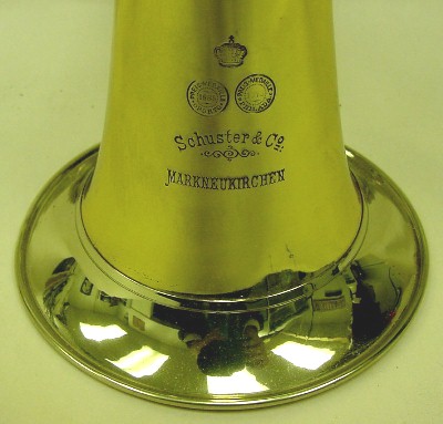 | Instrument - Fluglehorn Maker - Schuster & Co. Model - Date of Manufacture - FL003 ID # - pre 1926 Surface - brass Laq Markings - Schuster & Co. Marjenukirchen, Ealbacher Str 766/56, Germany Historical Detail - instrument was restored by Robb Stweart CA. Schuster & Co. operated 1881 to 1943, founded by Arnold W. Ludwig through the purchase of Paulus & Schuster. Used the trade name of Krone. |