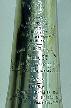 | Instrument - Trombone Museum Number - TB003 Maker - Antoine Courtois & Mille Model - Date of Manufacture - 1910's ID # - 5423 Surface - Silver Plate Markings - Antoine Courtois & Mille, Medaille 1st Class 1855, Medaille London 1862, Exop Univ 1867, Med L'Hon en Argent, Facteur Du Conservatoire Nat'l, 88 Des Marais St Martine, Paris 1st Prix Grand Med D'OR, Med D'Or 1878, 1889 & 1900 Historical Detail - Paris 1844-1917. Licenced by A Sax in 1855 to make brass instruments, Joined by Mille in 1870 and Mille took over the company in 1880, 1898 operated by E. Delfaux joined by Legay in 1915. Inventor of the Antoniophone in 1867 known as a 3 valve cor alto. |