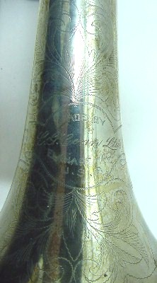 | Instrument - Trombone Museum Number - TB012 Maker -C. G. Conn Model -24H Date of Manufacture - 1930 ID # -273213 Surface - Silver plate Markings - made by C G Conn, Elkhart Ind USA Historical Detail - Established by Charles Gerard Conn, invented a rubber rim mouthpiece in 1874 and in 1876 established Dupont-Conn. By 1879 known as C. G. Conn & Co and bought Fiske in 1887 and operated this Worcester MA plant untill 1898. In 1917 had a work force of 550 and an output of 2500 instruments per month.. |