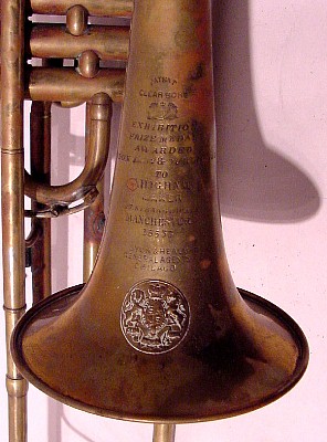 | Instrument - Trombone Museum Number - TB101 Maker - Joseph Higham Model - Alto in Eb - Valve Date of Manufacture - 1870s ID # - 35533 Surface - brass Markings - Joseph Higham, 127 Strangeways, Manchester, Exhibition prize metal awarded London 1852 and Dublin 1863. with addition tuning slide Historical Detail - 1842-1950. Established by Joseph Higham (born 1818). His son in law Peter Robinson took over the business in 1883. By 1893 46,000 instruments were produced with a workforce of 90. |