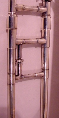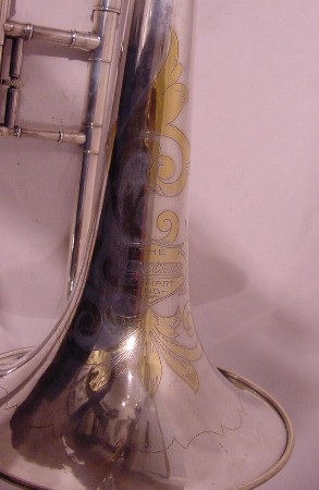 | Instrument - Trombone Museum Number - TB112 Maker -Buescher Model - True Tone Date of Manufacture -1908 ID # - 235835 Surface - Silver Plate Markings - Gold Wash on Bell within scroll work, Pat 10/22/07, Tuning in slide Historical Detail -1894-1950. Started by Ferdinand August Buescher who worked by Conn-Dupont from the age of 15. May have made the first Saxophone in the U.S. 1894 as Buescher Manufacturing Co, 1904 as Buescher Band instrument Co. 1928 purchased by Elkhart Band Instrument Co. They sucessfully competed with Conn and had a well known scandal but did share parts and designs. |
